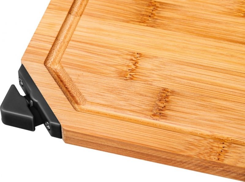 Дъската за рязане, изработена от бамбуков материал, включва точило за ножове с волфрамови камъни от неръждаема стомана, което заточва остриетата и реформира "V" профила на острието.