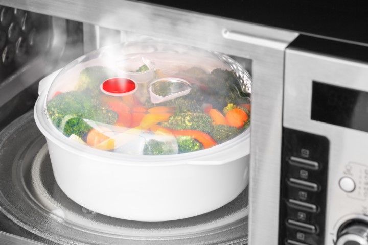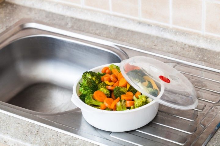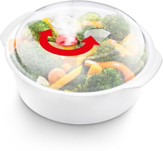 Многофункционална пластмасова купа, предназначен и за нагряване в микровълнова фурна, контейнерът включва затварящ се капак с отдушник и решетка за пара.