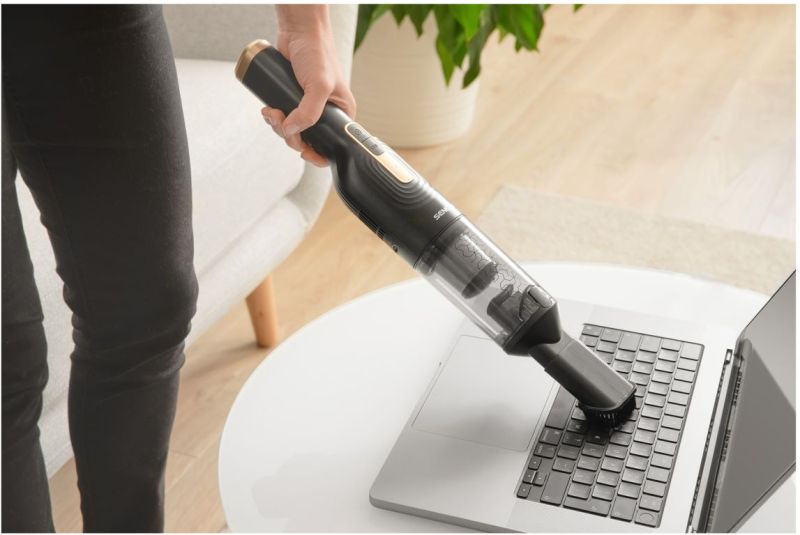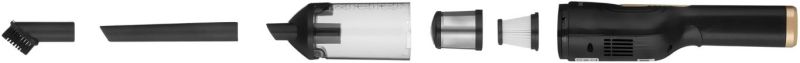 - Безжична ръчна прахосмукачка с основа за зареждане за удобно съхранение и вграден държач за аксесоари